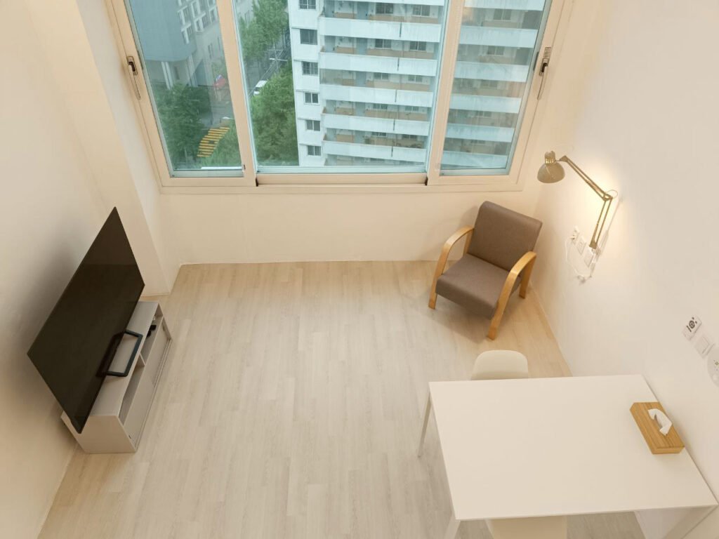 Sleek Workspace: Equipped with a clean dining/work table and a large flat-screen TV for your entertainment and productivity.
